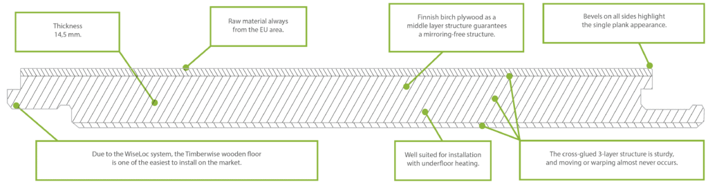 - roble 150, 185 y 230 mm: espesor de la capa superficial aprox. 3mm
