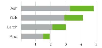 El valor de Brinell describe la diferencia de dureza de diferentes especies de madera. Cuanto mayor sea el valor Brinell de una especie de madera, mejor podra soportar el suelo el impacto y el desgaste. La tabla adyuvante muestra la dureza promedio de las especies de madera usada en los parquets de tablones Timberwise. Por ejemplo, el valor Brinell de la ceniza es de 3,2 a 4,7. ¡NO UN! El pino ha sido eliminado de nuestra gama de productos.